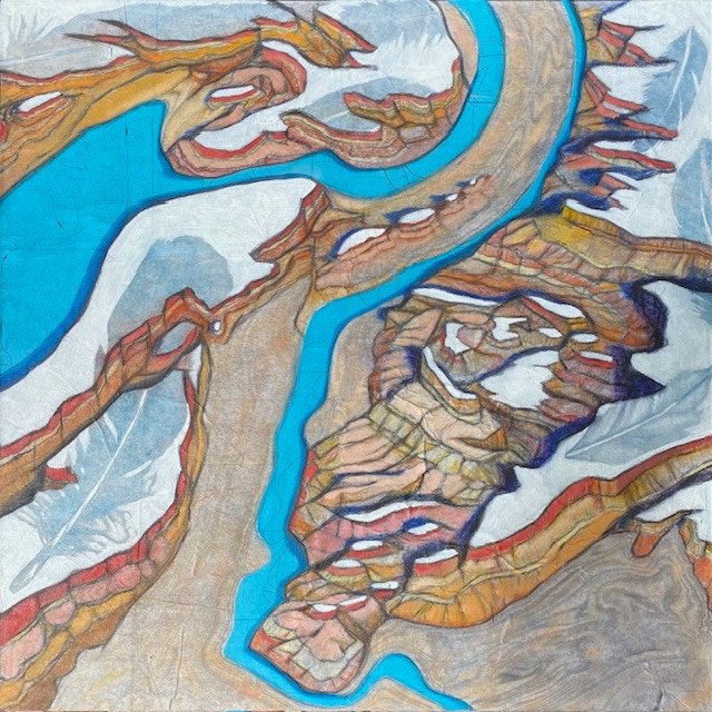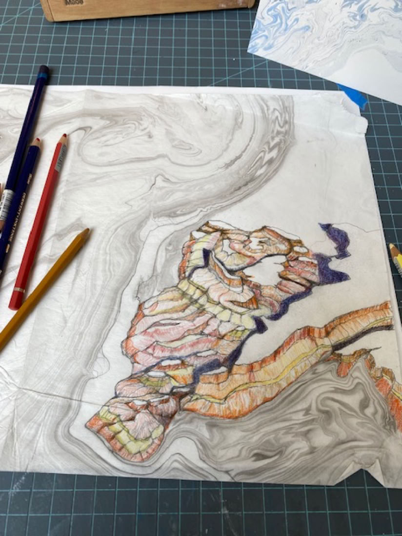 Carrie and I had discussed ideas for pieces we were playing around with, one being a series of aerial landscapes, a view from flying over different parts of the world. I pulled a few sheets of marbled paper and feather prints from her progress work table. The marbled paper looked like the mesas and water channels of the Southwestern US. I started drawing in the white space on the paper without a plan for a finished piece. I just started drawing, added color with pencil, then added feather prints to the tops of what looked like mesas. No plan. I just enjoyed the act of creating. I eventually added some paint to the finished piece, and in the end, it may resemble a bit of Carrie's work, mine, or something else entirely. The finished look of the artwork may not be the most important outcome. Through this process, I've understood that making and sharing, not being hindered by trying new things, is the heart of collaborating with Carrie.
